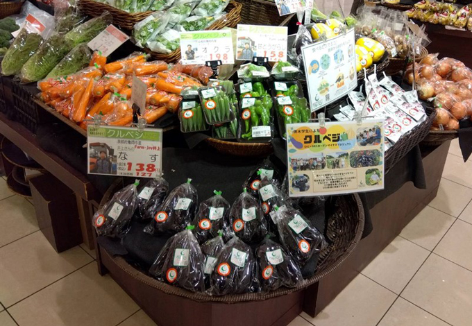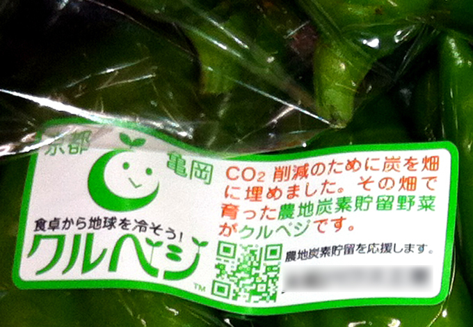 バイオ炭を撒いた田畑で栽培した作物を「クルベジ®」というブランド名で販売しています。クルベジ®の認証を受けた農産物は、ロゴの入ったシールを貼って販売できるため、ほかの農産物と差別化したり社会貢献をPRしたりでき、イメージの向上にもつながります。